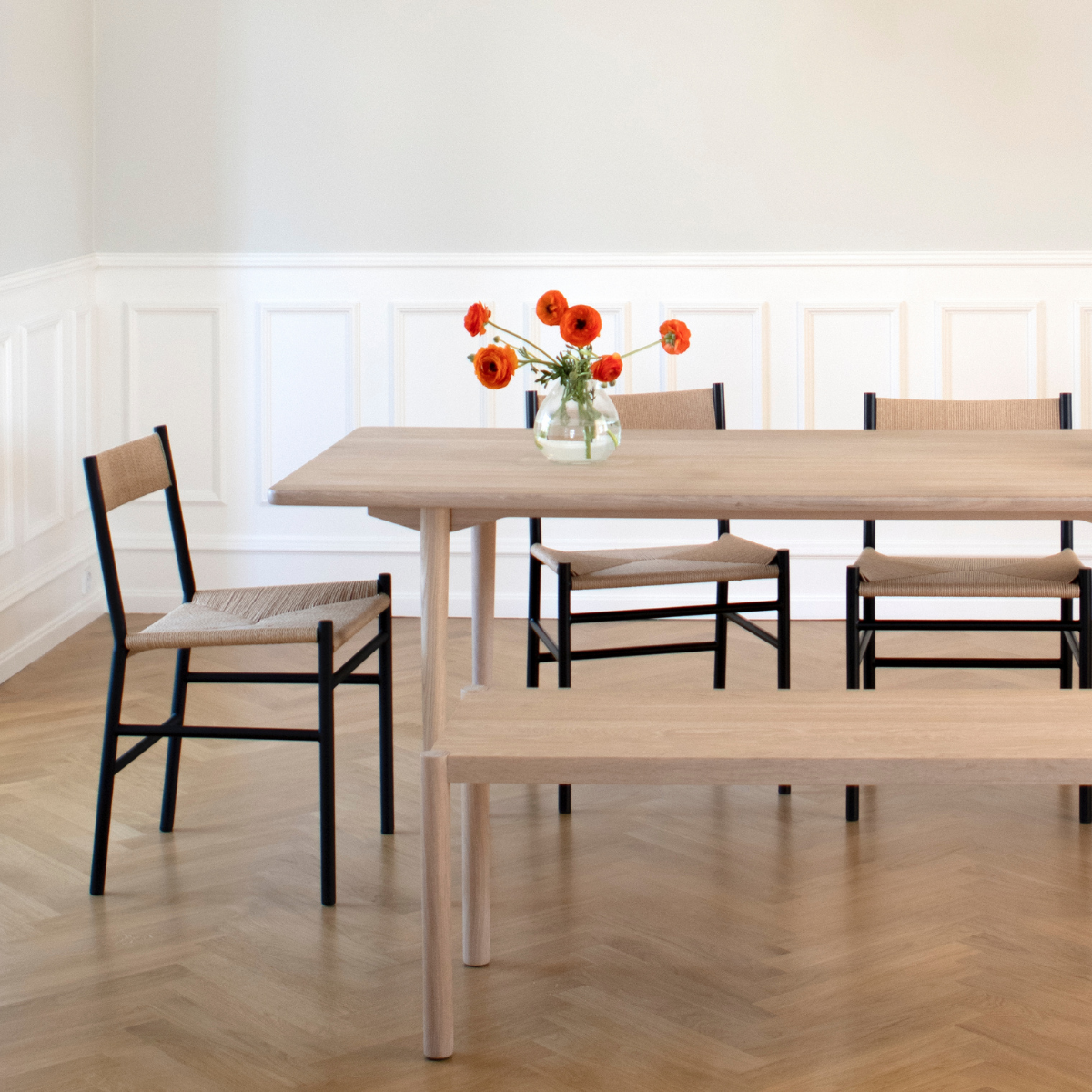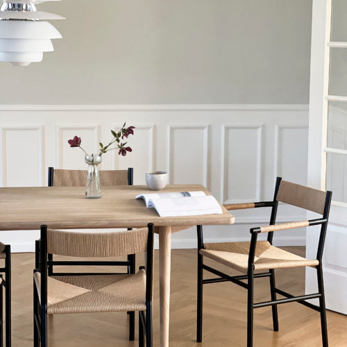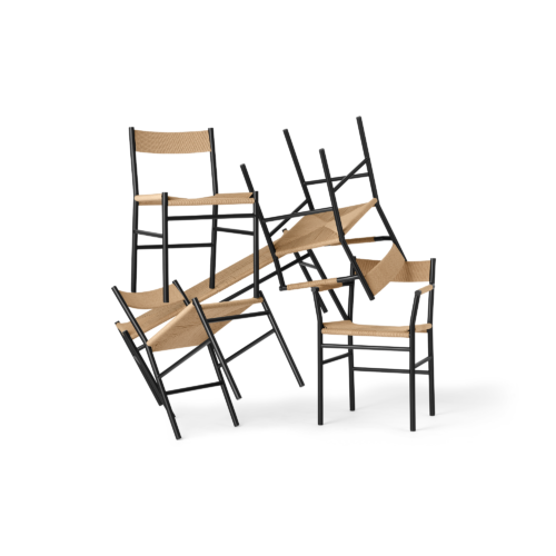 Die Möbel werden aus recycelbarem, pulverbeschichtetem Stahl hergestellt. Rückenlehne, Sitzfläche und Armlehnen des Stuhls werden klassisch mit Papiergeflecht handgeflochten. Wenn die Möbel eines Tages nach vielen Jahren entsorgt werden müssen, können Geflecht und Stahl leicht getrennt werden, sodass sie sortiert und recycelt werden können.