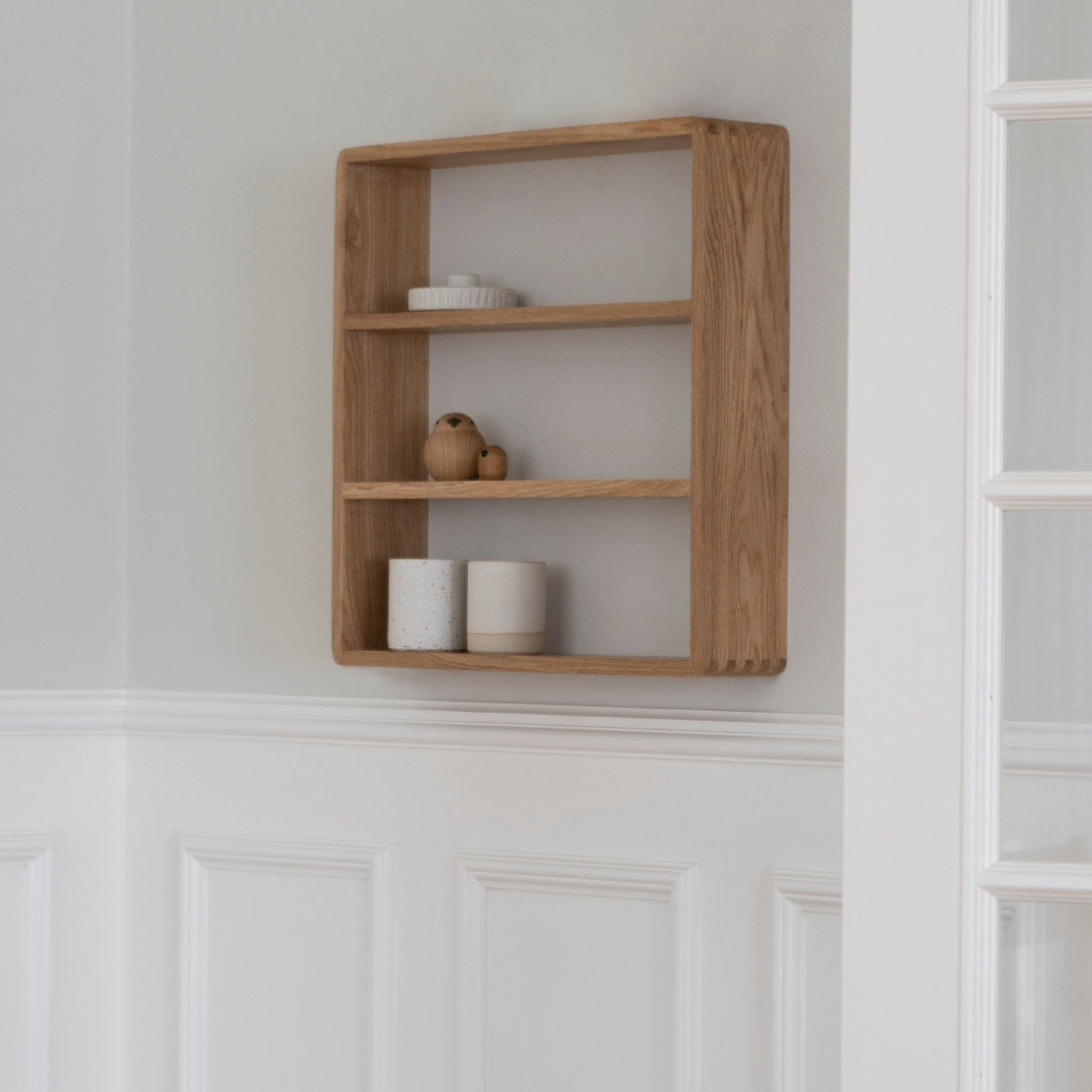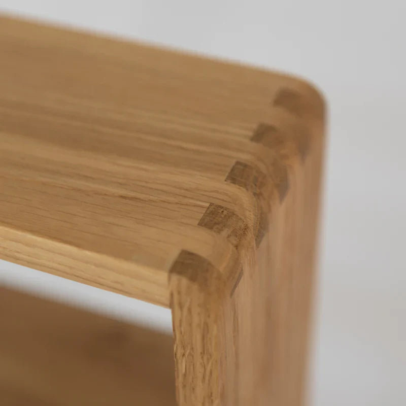 Jedes Detail ist sorgfältig durchdacht und präzise ausgeführt. Der Rahmen ist mit schönen Fingerzinken-Verbindungen konstruiert, die einen zeitlosen und edlen Ausdruck schaffen. Diese präzise gefertigten Verbindungen sorgen für eine starke und langlebige Struktur, die das CUPMUG Eichenholz-Regal viele Jahre stabil hält.