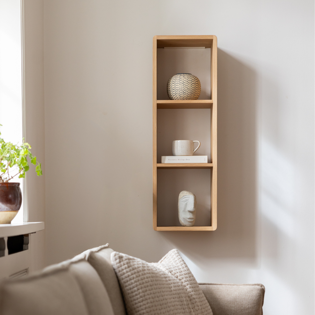 Die Regale sind ohne Rückwand entworfen, was ein leichtes und luftiges Erscheinungsbild schafft. So können Sie die Wandfarbe hinter den Regalböden zusammen mit Ihren Lieblingsgegenständen zeigen. Dieses einzigartige Design macht die Einrichtung persönlicher, da Sie mit Farben experimentieren können, um verschiedene visuelle Effekte zu erzielen. Die Kombination aus natürlichen Materialien, handwerklicher Qualität, versteckter Halterung und der Möglichkeit zur persönlichen Gestaltung macht diese Regale zu einer idealen Ergänzung für jedes Zuhause.